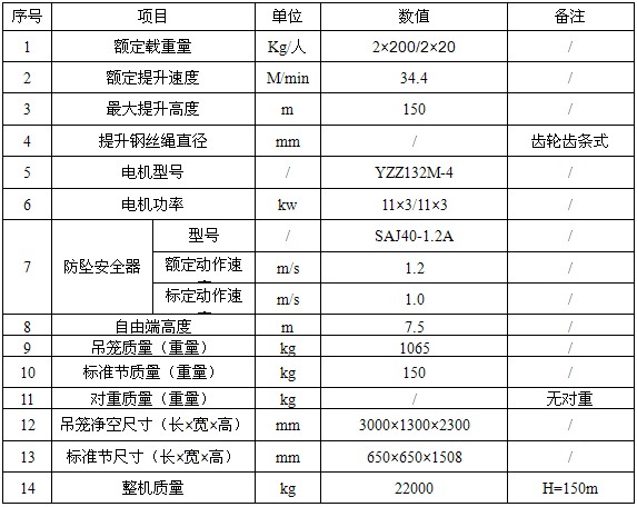 主要結(jié)構(gòu)形式:齒輪齒條式、客貨兩用、無對重、并聯(lián)三驅(qū)動;標(biāo)準(zhǔn)節(jié)主弦桿材料(規(guī)格/材質(zhì),mm):Φ76×4.5無縫鋼管/20#。